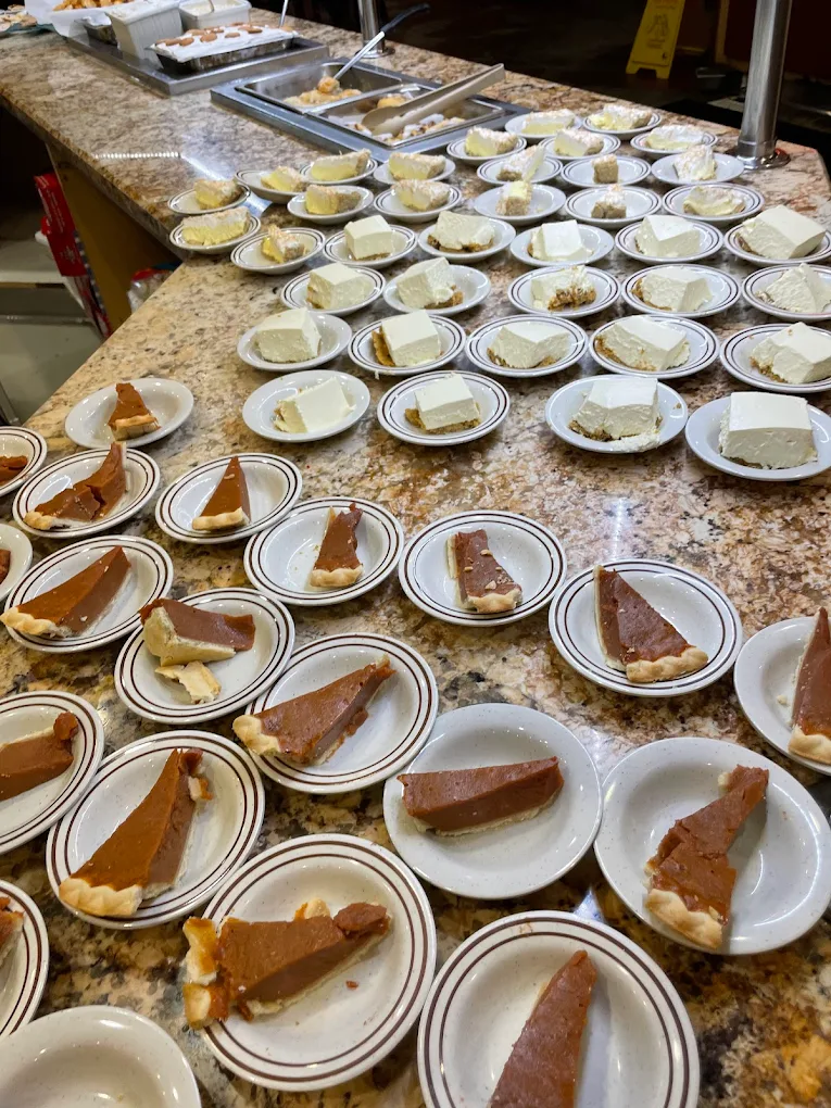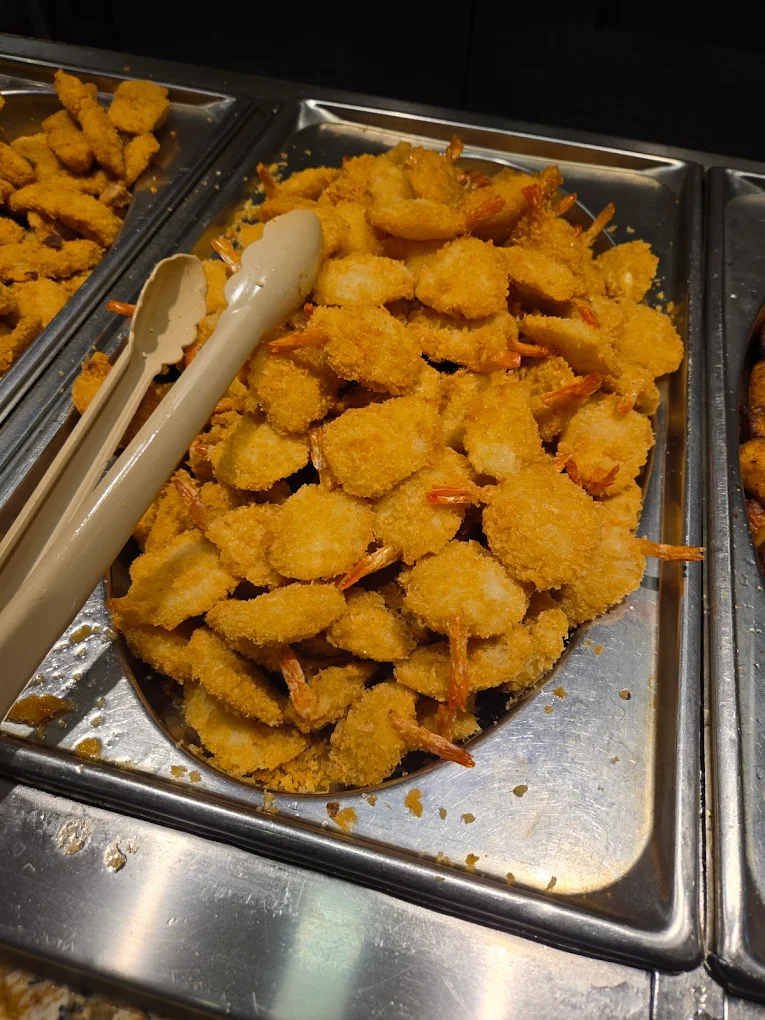 All stations including salad, hot line, hibachi grill, and dessert bar — crab legs when advertised on the marquee.