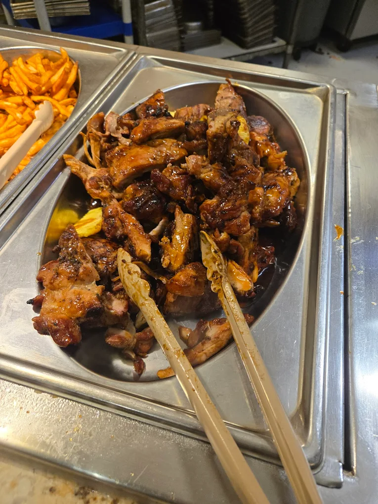 Pick proteins and veggies at the grill counter; included with dinner buffet on busy nights.